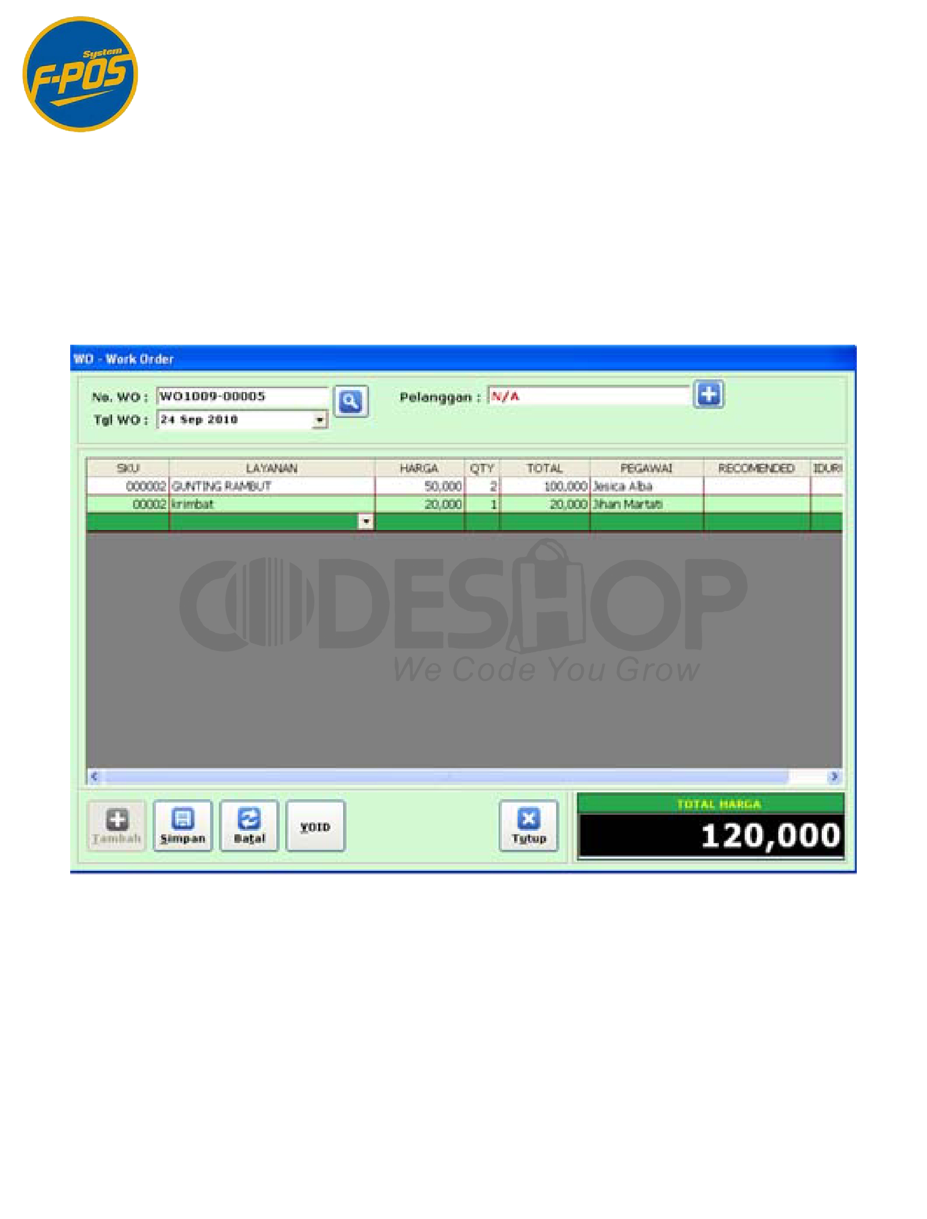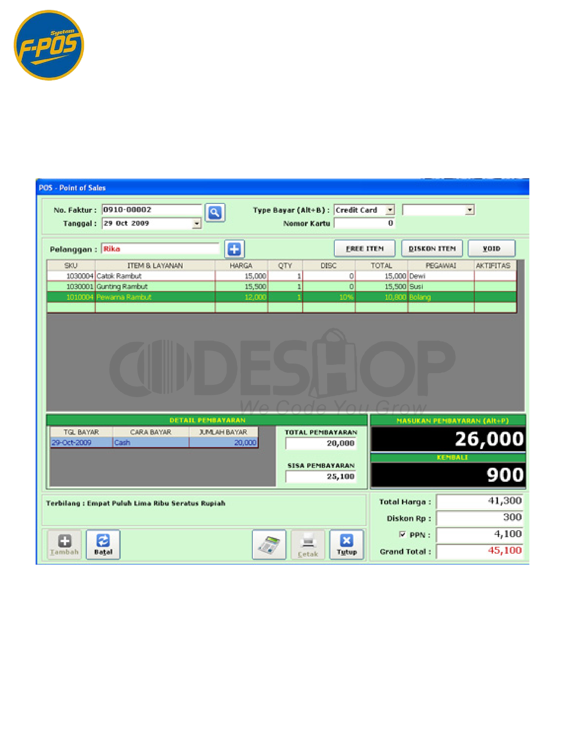 F-POS Software Salon adalah sistem kasir dan manajemen khusus untuk salon kecantikan, barbershop, dan spa. Dengan fitur lengkap dan mudah digunakan, F-POS membantu pencatatan transaksi, penjadwalan pelanggan, serta pengelolaan stok produk kecantikan secara efisien.