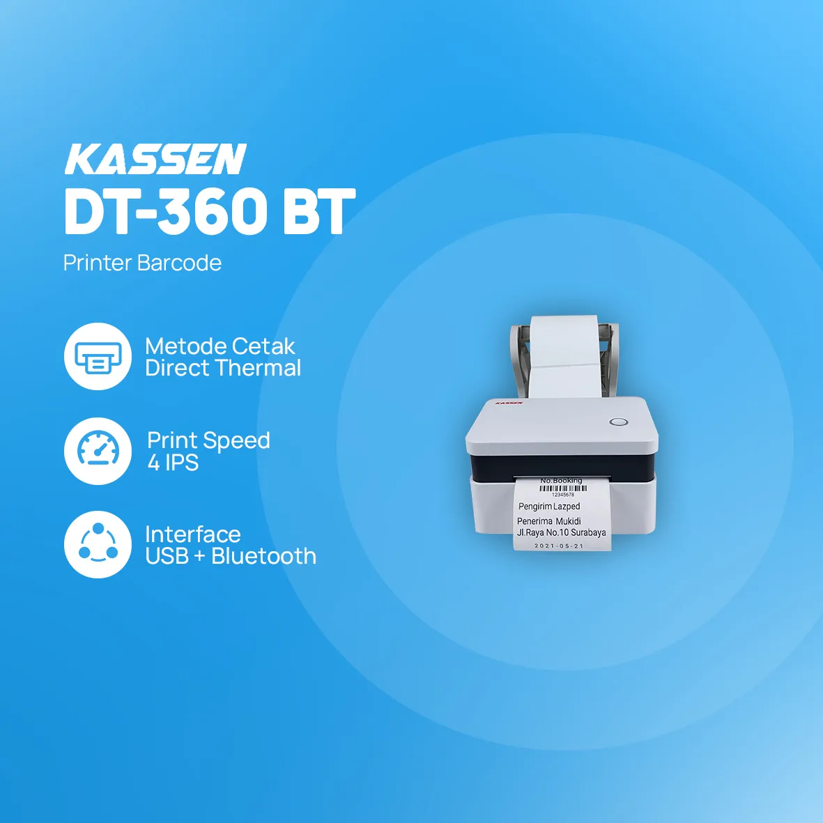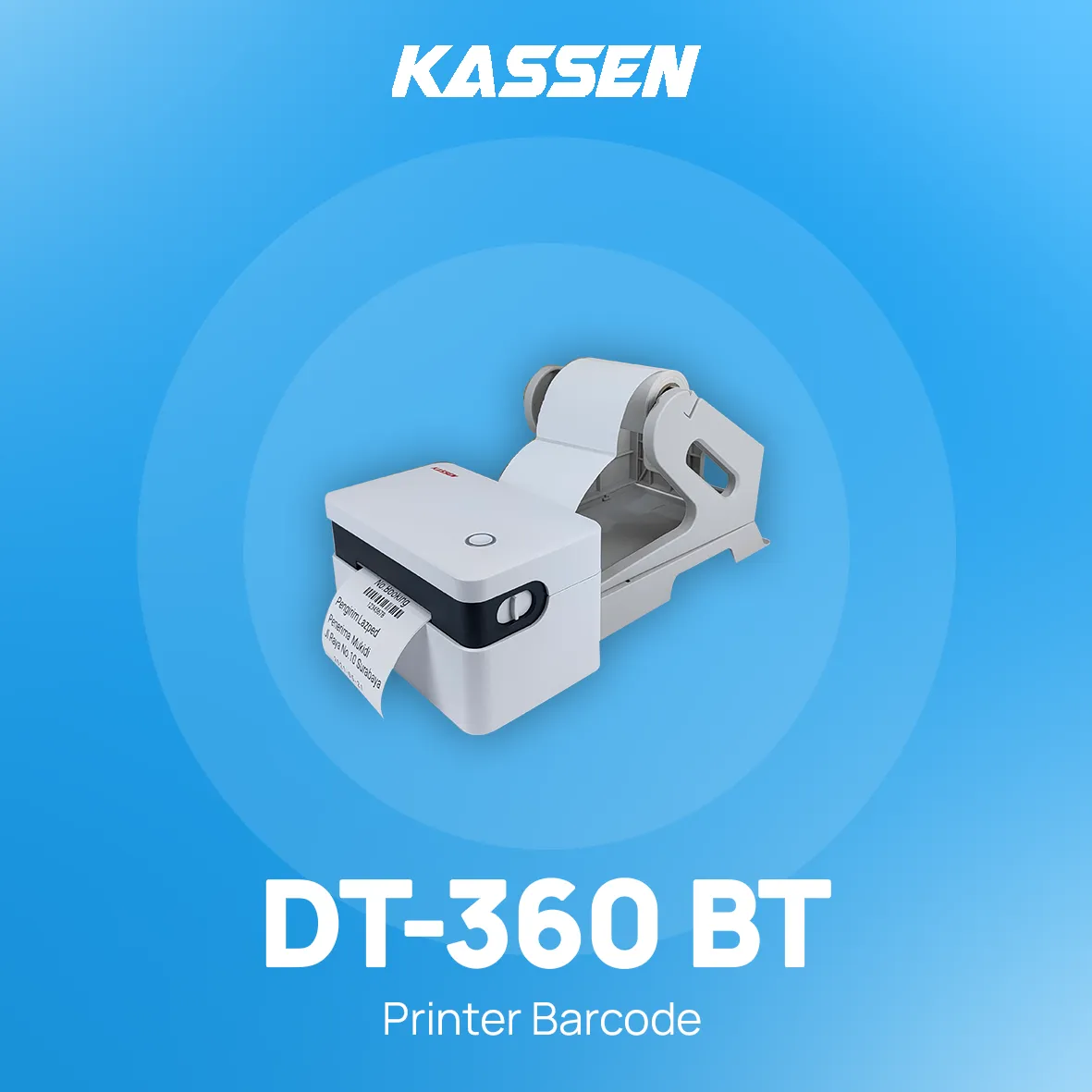 Printer Barcode Kassen DT-360 BT adalah printer barcode thermal langsung dengan koneksi Bluetooth yang dapat mengisi label thermal 80mm. Printer ini juga sangat mudah diletakkan dimana saja karena memiliki ukuran yang mini, selain itu juga dapat dioperasikan dari android atau laptop anda. Sangat cocok untuk digunakan dalam pelayaran/ekspedisi, retail, rumah sakit, F&B, e-commerce, dll.