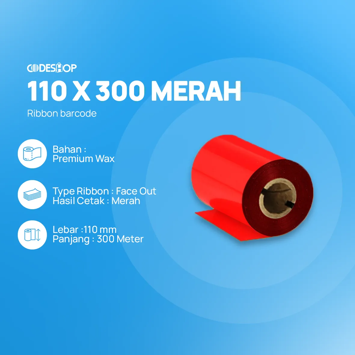 Spefikasi RIBBON BARCODE WAX 110X300 MERAH :