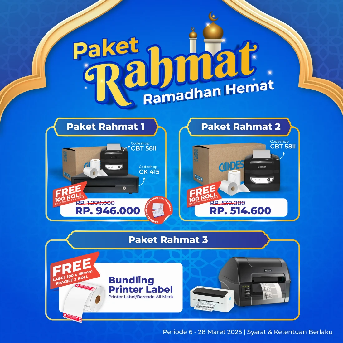 Menyambut bulan suci Ramadhan 2025, CODESHOP menghadirkan promo spesial "Paket Rahmat Ramadhan Hemat" untuk Anda! Dapatkan berbagai pilihan printer struk dan printer label dengan harga terbaik, lengkap dengan.